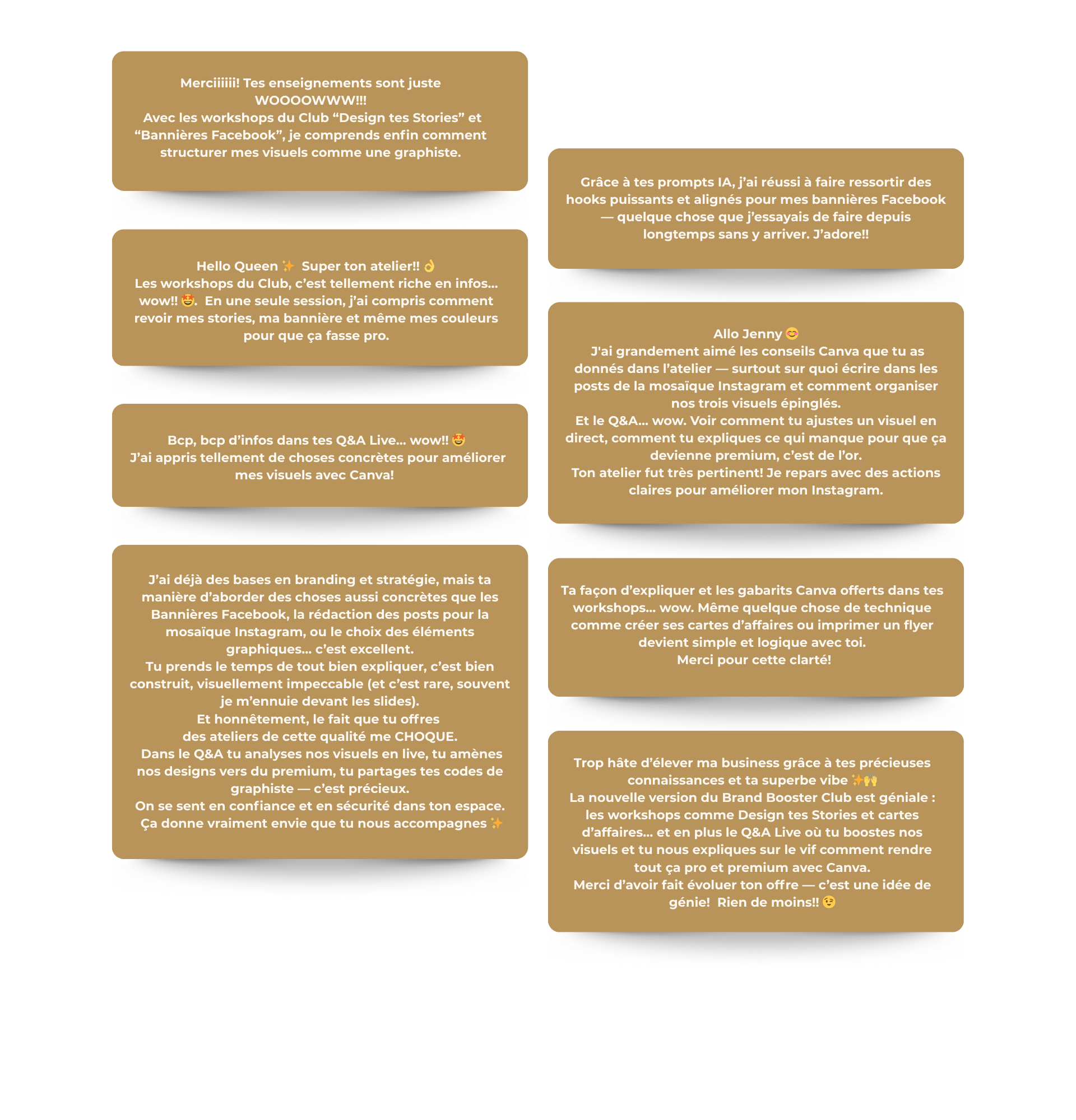 "Ton accompagnement dans le Brand Booster Club m’a donné des outils concrets, de la structure et la confiance pour créer un branding aligné, professionnel et cohérent."